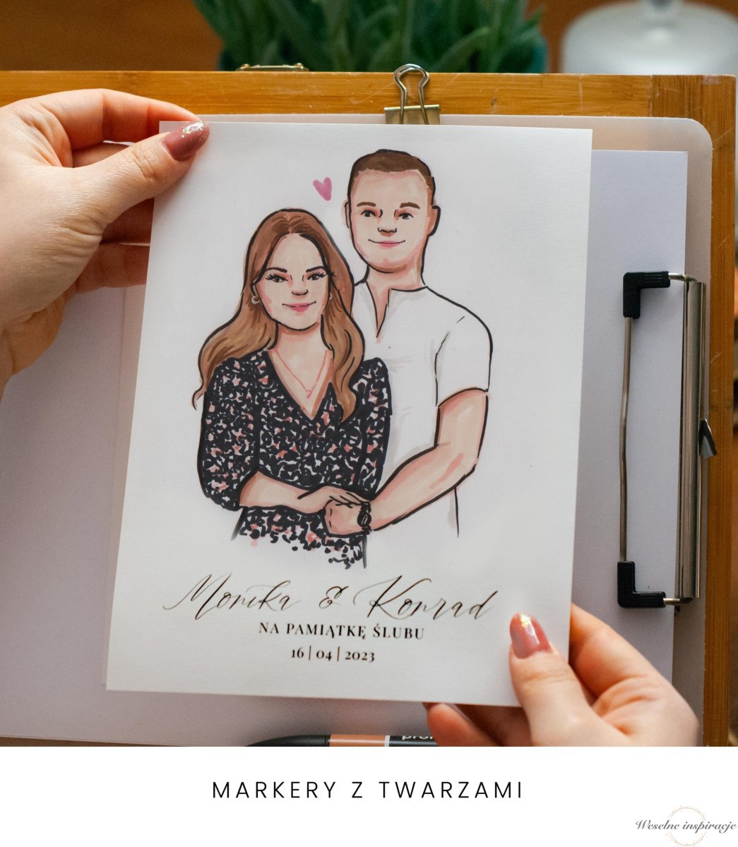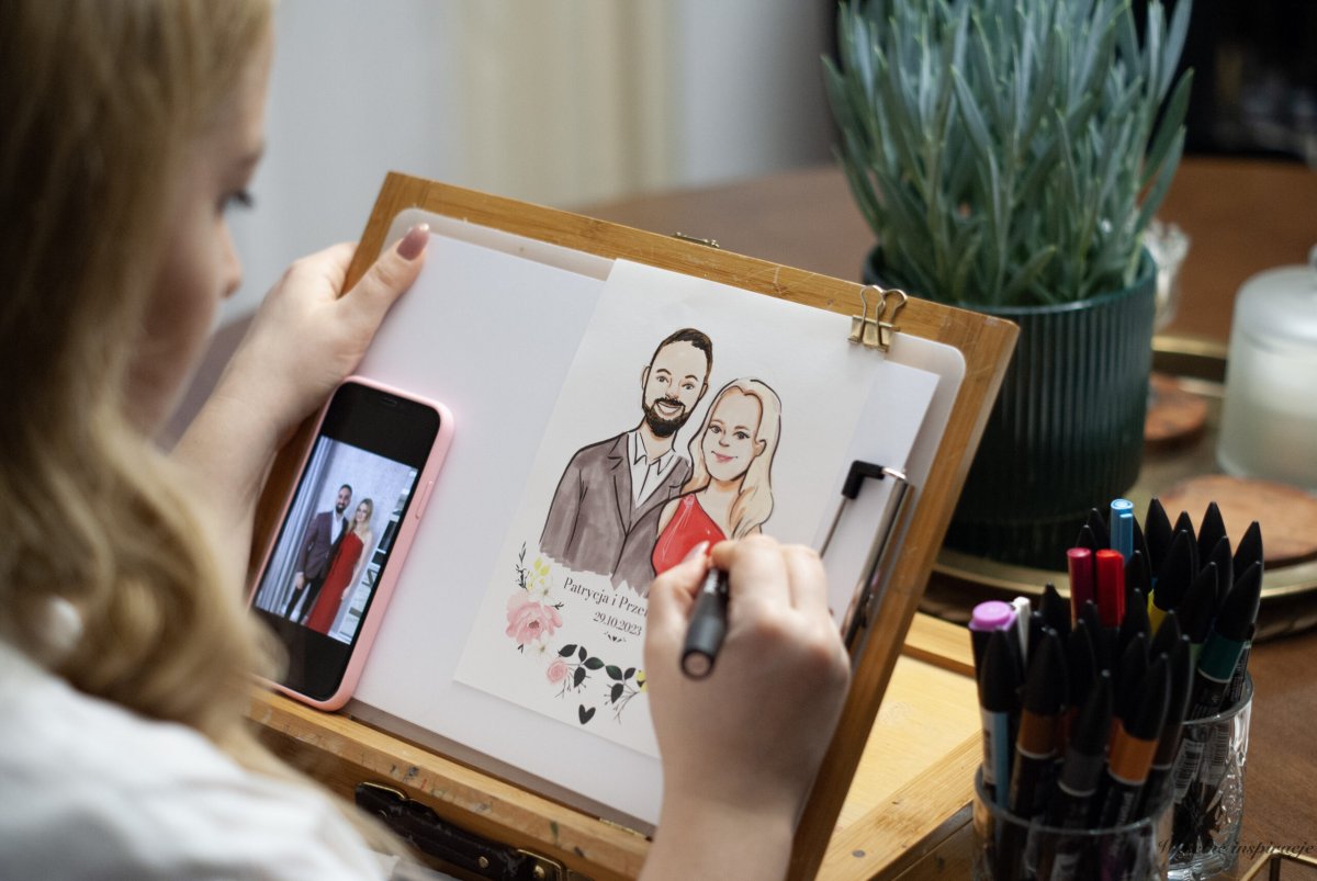 Podczas całego przyjęcia tworzę portrety gości w dwóch technikach: akwarelą lub markerami, w zależności od stylu i klimatu Waszej uroczystości. Każdy portret staje się pamiątkowym upominkiem, który goście mogą zabrać ze sobą – prezentem od Was, który wyróżnia się na tle tradycyjnych zdjęć i fotobudek.