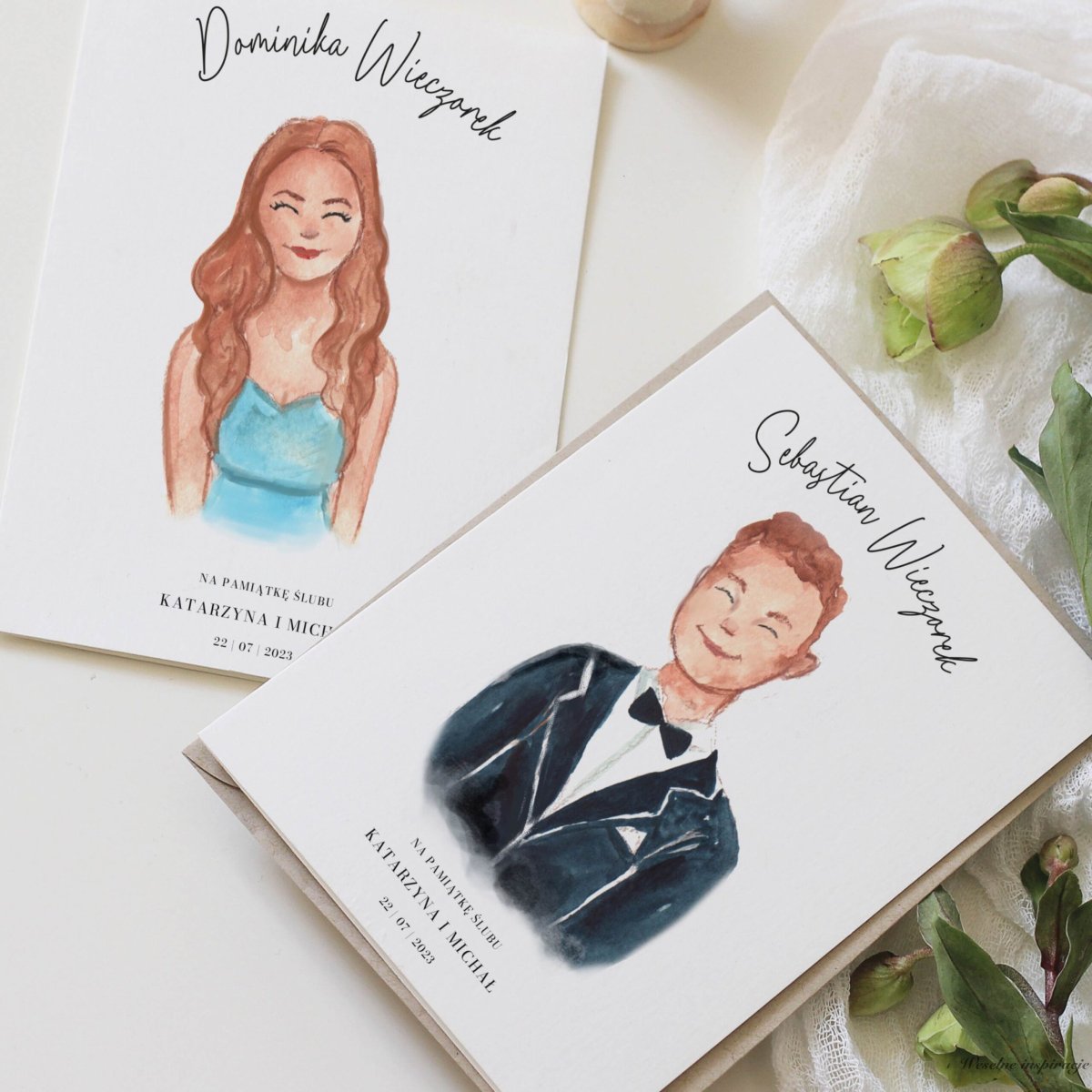 Portrety tworzę w trakcie przyjęcia, bazując na zdjęciach gości wykonanych po obiedzie, dzięki czemu nie zajmuję czasu Waszym gościom.